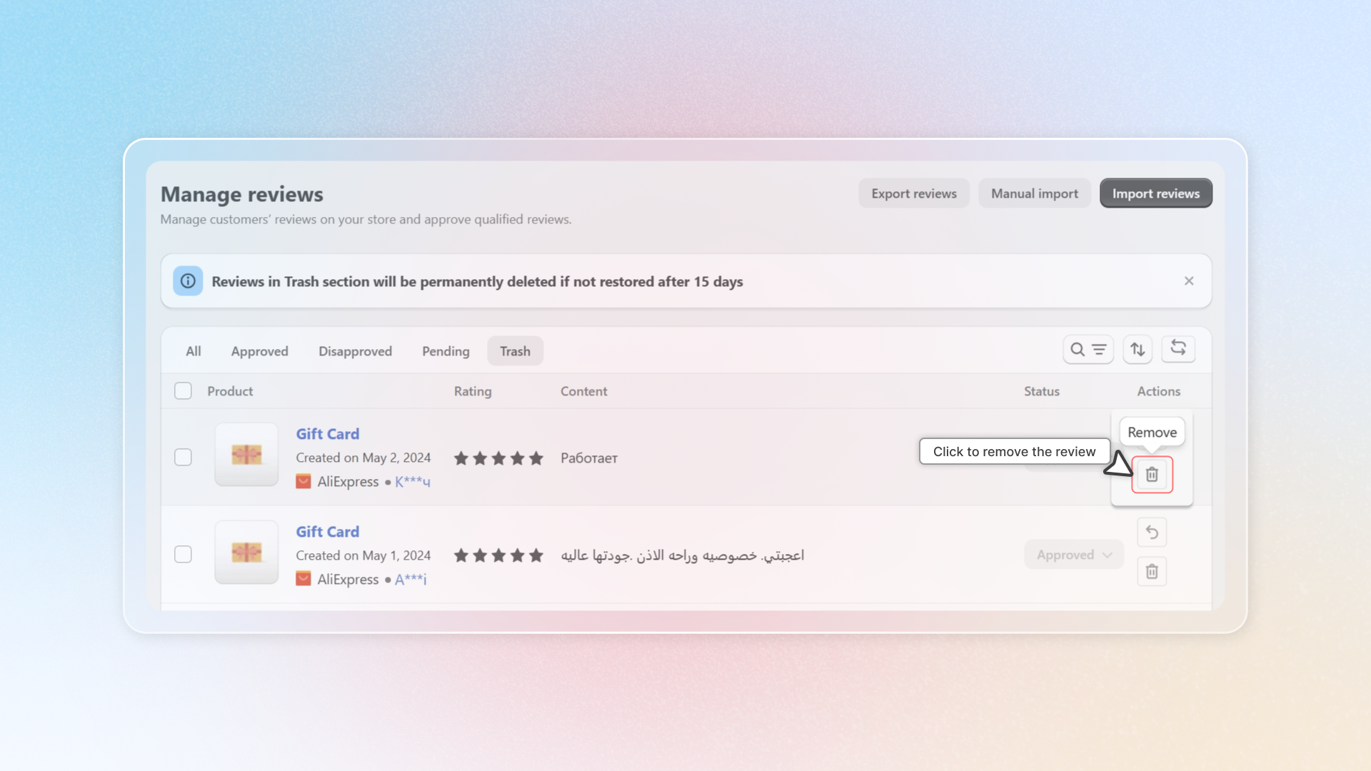 **Remember:** Reviews imported from platforms like Amazon or AliExpress cannot be edited or recovered through the Recycle bin feature.